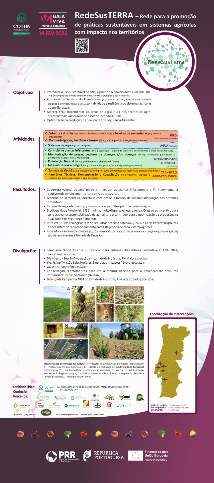 Poster do projeto RedeSusTERRA, apresentado na VI GALA VIVA Frutas e Legumes de Portugal, a 14 de fevereiro de 2025, em Alcobaça.